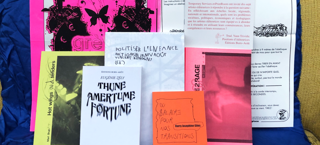 Depuis 2019, les éditionsBurn~Août dispersent, reproduisent et accompagnent des voix critiques contemporaines, que ce soit à travers la poésie, la littérature, les essais ou des formes hybrides.