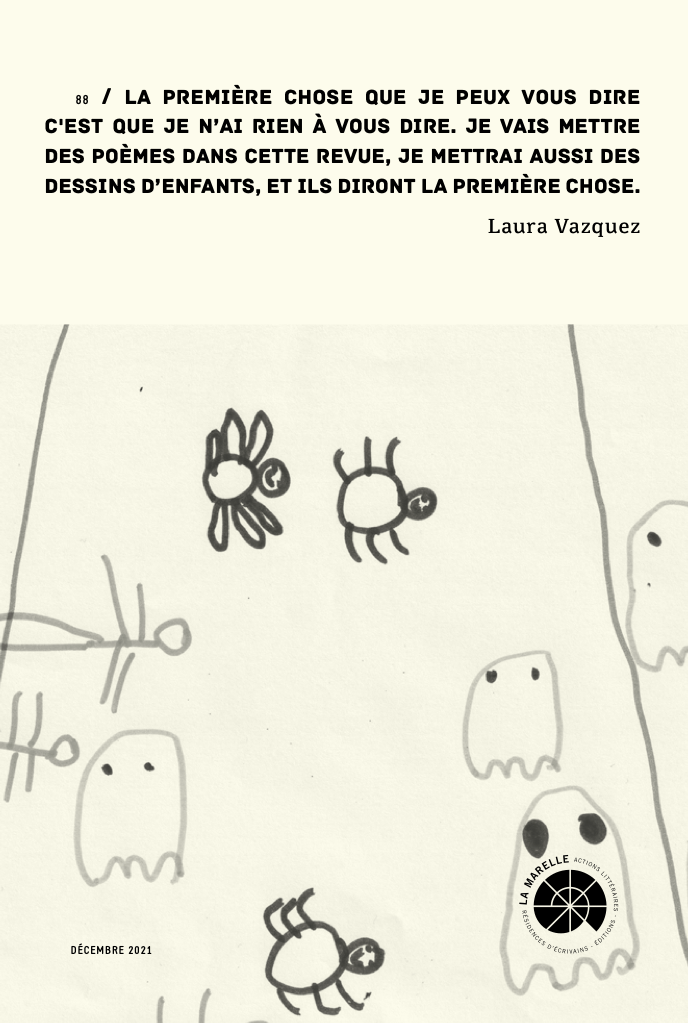 Laura Vazquez vit à Marseille où elle se consacre l’écriture. Ses livres sont publiés aux éditions Maison Dagoit, L’arbre à parole, Plaine Page, et Cheyne éditeur. On trouve aussi ses textes au sommaire de nombreuses revues (If, Nioques, Espace(s), La mer gelée, Panthère Première…). Ses poèmes ont été traduits en chinois, anglais, espagnol, portugais, norvégien, néerlandais, allemand, italien, et arabe. En 2014, elle reçoit le prix de la Vocation pour son premier livre La main de la main. Elle donne régulièrement des lectures publiques de ses poèmes à travers le monde : Ming Contemporary Art Museum de Shanghai (Chine), Centre Pompidou (Paris), Fondation Louis Vuitton (Paris), Musée d’art contemporain de Genève (Suisse), Maison de la poésie de Paris, Norsk Litteraturfestival (Norvège), Festival Voix Vives de Tolède (Espagne), Centre d’art Perdu à Amsterdam (Pays-Bas)… Elle codirige la revue Muscle.Et elle fait partie du groupe Tsuku.