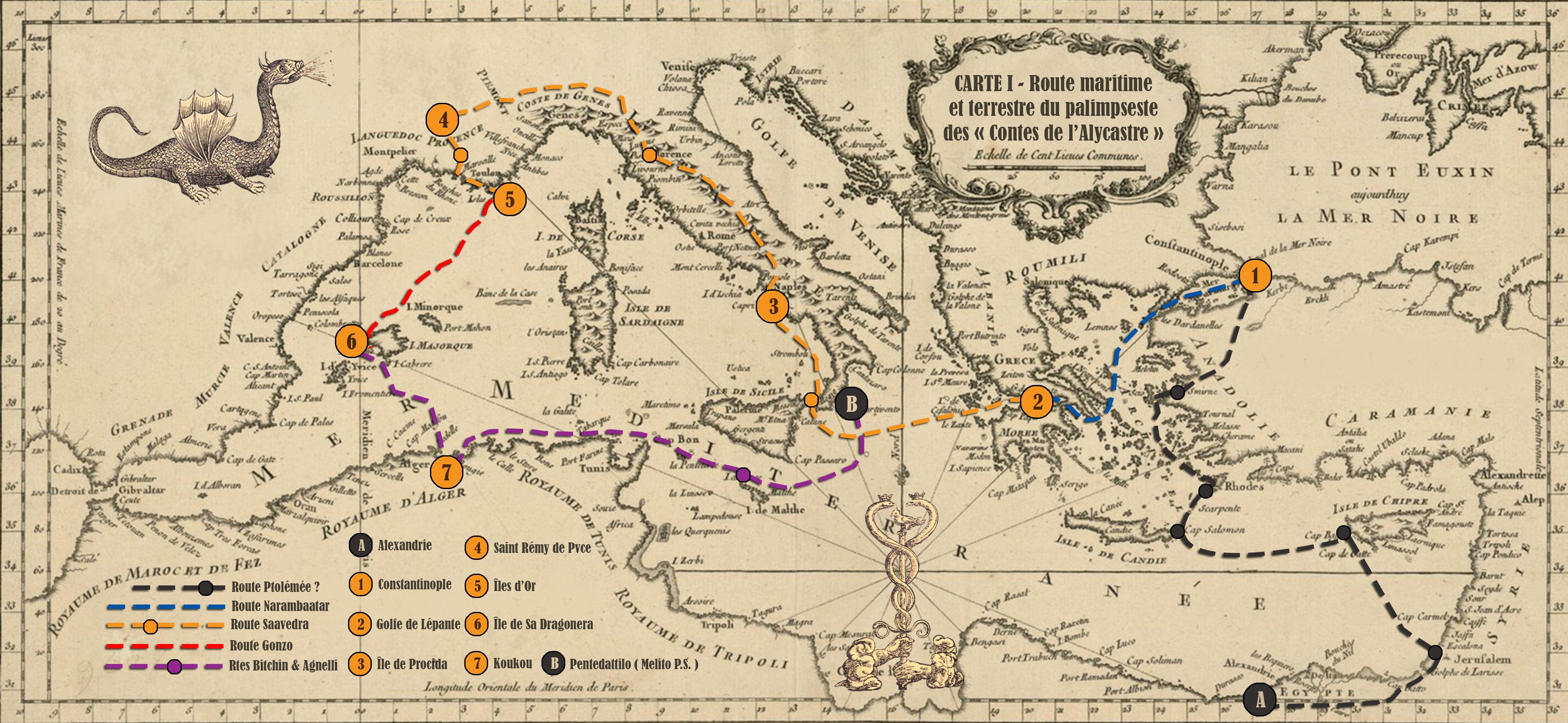Extrait du carnet de bord des « Contes de l’Alycastre » de Dominique Dattola, directeur de la publication, en résidence à la Cité du Livre d’Aix-en-Provence, le 30 anvier 2017. Carte de la route du palimpseste des Contes de l’Alycastre compilée au Labo511 d’AZOTH Studio.