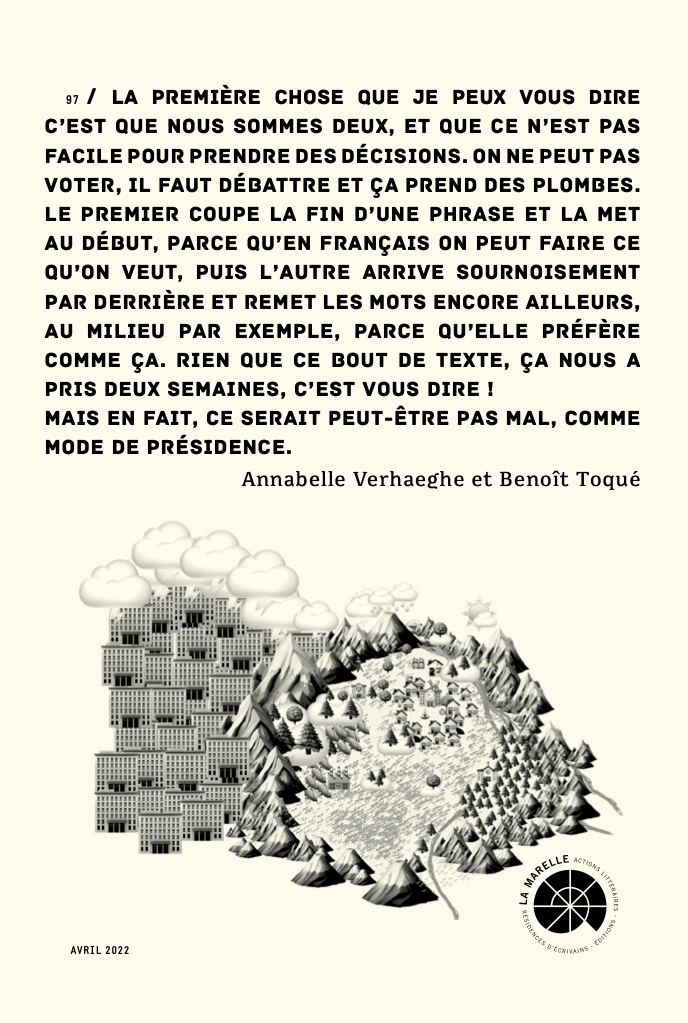 La première chose que je peux vous dire c’est que nous sommes deux, et que ce n’est pas facile pour prendre des décisions. On ne peut pas voter, il faut débattre et ça prend des plombes. Le premier coupe la fin d’une phrase et la met au début, parce qu’en français on peut faire ce qu’on veut, puis l’autre arrive sournoisement par derrière et remet les mots encore ailleurs, au milieu par exemple, parce qu’elle préfère comme ça. Rien que ce bout de texte, ça nous a pris deux semaines, c’est vous dire ! Mais en fait, ce serait peut-être pas mal, comme mode de présidence.