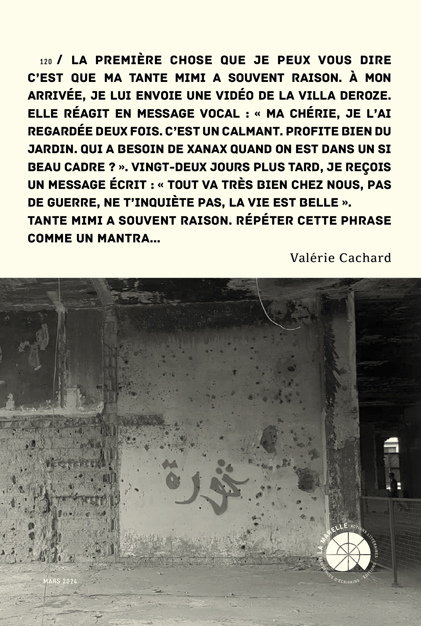 La première chose que je peux vous dire c’est que ma tante Mimi a souvent raison. À mon arrivée, je lui envoie une vidéo de la Villa Deroze. Elle réagit en message vocal : « Ma chérie, je l’ai regardée deux fois. C’est un calmant. Profite bien du jardin. Qui a besoin de Xanax quand on est dans un si beau cadre ? ». Vingt-deux jours plus tard, je reçois un message écrit : « Tout va très bien chez nous, pas de guerre, ne t’inquiète pas, la vie est belle ». Tante Mimi a souvent raison. Répéter cette phrase comme un mantra…
