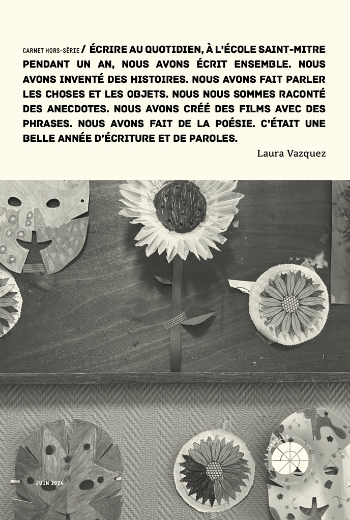 Pendant toute l’année scolaire 2023-2024, Laura Vazquez a mené des ateliers d’écriture quotidiens à l’École élémentaire Saint-Mitre avec des classes de CE1 et CE2. Ce projet d’éducation artistique et culturelle, porté par La Marelle et le Laboratoire de neurosciences cognitives de l’Université Aix-Marseille, en partenariat avec Musicatreize, a reçu en 2023 le Grand Prix Sofia de l’action littéraire, catégorie Éducation (avec Télérama et le magazine LIRE). Ce projet est soutenu par la Ville de Marseille, AMPIRIC et le CFC (Centre français d’exploitation du droit de copie).
