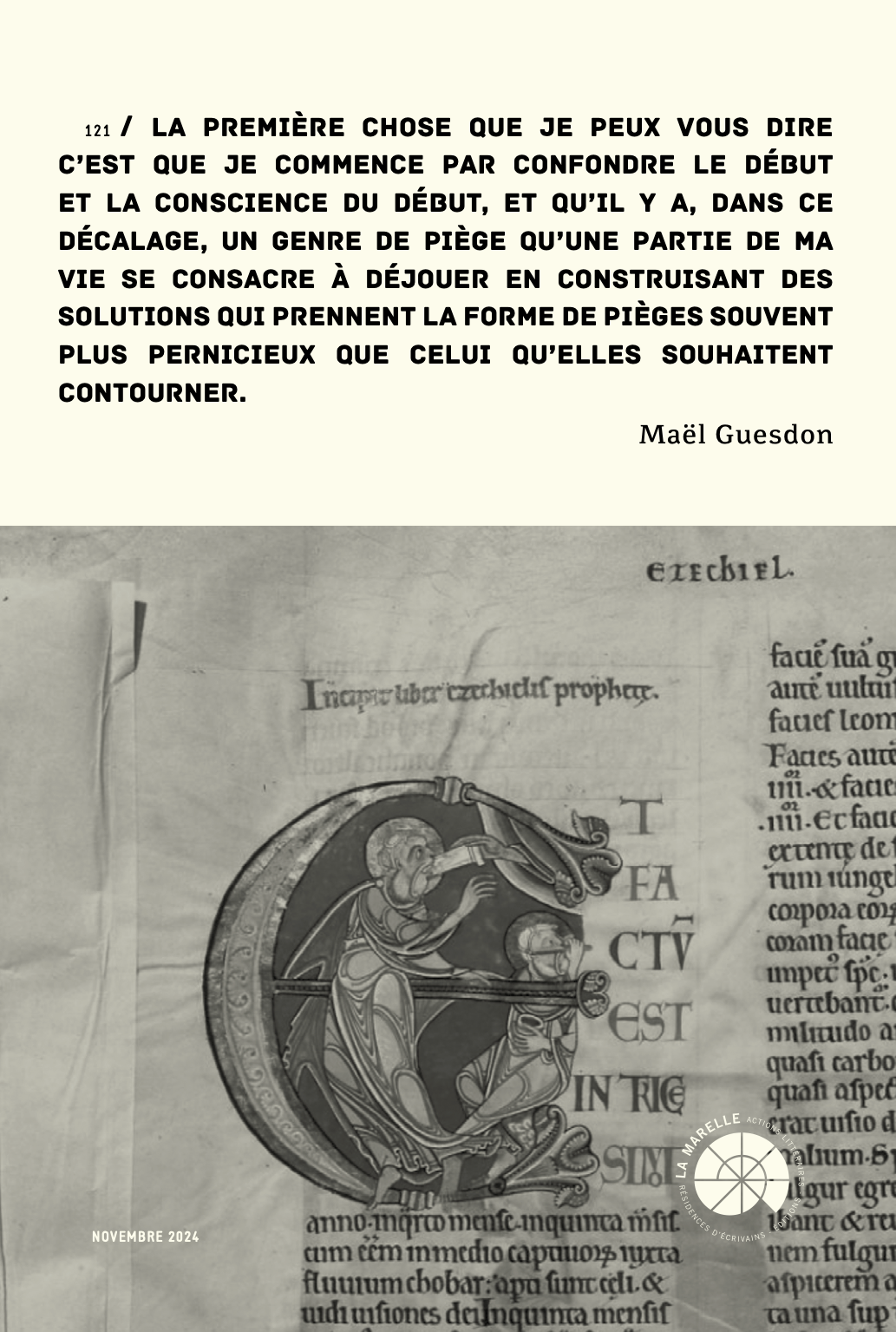 Grâce au partenariat engagé avec La Marelle, le Cipm a souhaité coproduire cette résidence, ponctuée par une rencontre à la librairie L’Odeur du Temps le 26 octobre 2023. Nous avions proposé à Maël d’inviter à son tour un auteur ou une autrice. Maël n’a pas lu un texte mais parlé, livré un récit autour d’un texte ; à moins qu’il s’agit d’un tressage entre le parlé et l’écrit, puisqu’il a été vite difficile de discerner la forme exacte de cette voix. Son invitée, Elsa Boyer, autrice de récits et d’essais, a lu quant à elle un travail de poésie déclenché par cette invitation même ; chacun réalisant ainsi un pas de côté dans son écriture, et offrant un moment d’expérimentation heureuse. Ce texte d’Elsa Boyer est déjà devenu un livre (Laminaire, Zoème, 2024), et Maël Guesdon poursuit à la fois ses projets de livre et sa codirection des éditions Corti avec Marie de Quatrebarbes. « Quand un son persiste, un autre le prolonge, mais sous quelle condition ? » De le suivre. Nous le suivons.