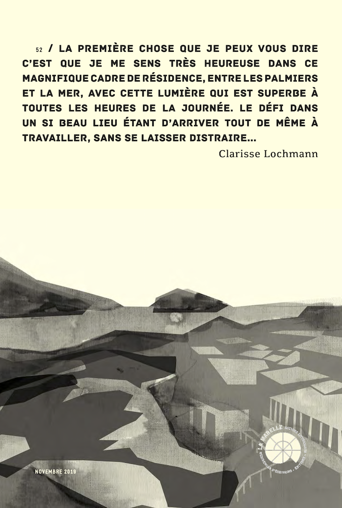 La première chose que je peux vous dire c’est que je me sens très heureuse dans ce magnifique cadre de résidence, entre les palmiers et la mer, avec cette lumière qui est superbe à toutes les heures de la journée. Le défi dans un si beau lieu étant d’arriver tout de même à travailler, sans se laisser distraire…