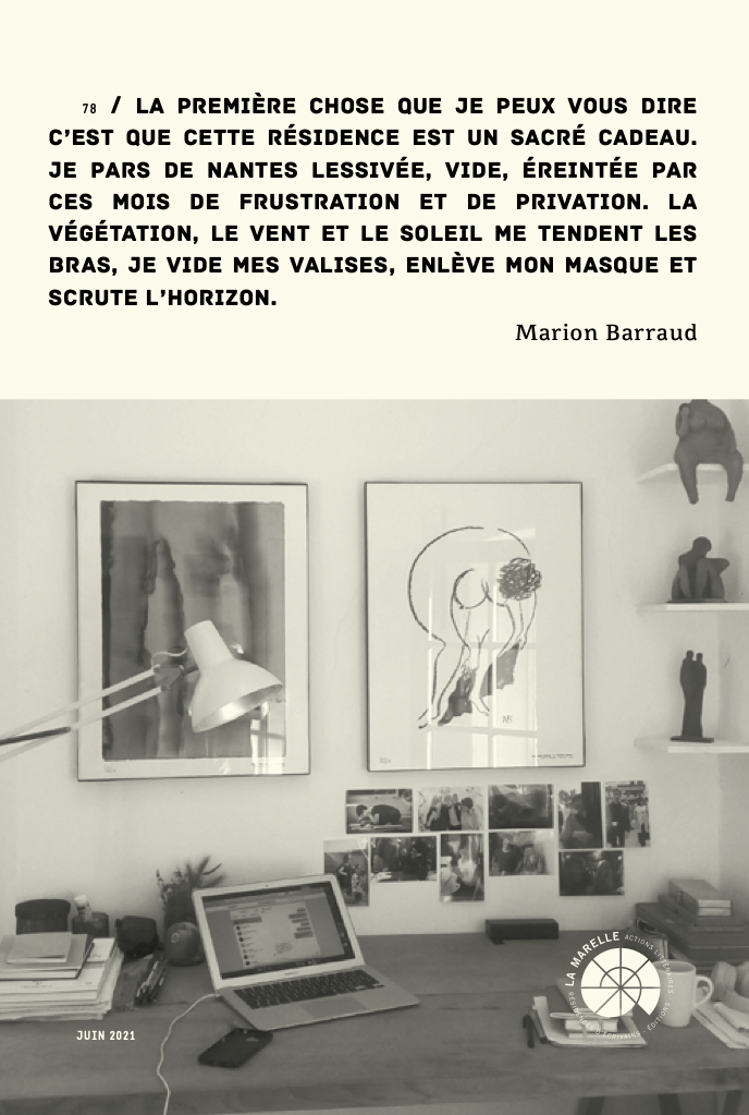 La première chose que je peux vous dire c’est que cette résidence est un sacré cadeau. Je pars de Nantes lessivée, vide, éreintée par ces mois de frustration et de privation. La végétation, le vent et le soleil me tendent les bras, je vide mes valises, enlève mon masque et scrute l’horizon.