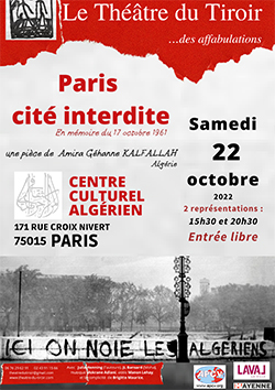 Sur un plateau de théâtre, à la Cartoucherie de Vincennes, une femme réfléchit à l’écriture de sa prochaine pièce. Soudain, surgir un homme qui exige que son histoire soit racontée. Son histoire est celle du fleuve de Paris qui a avalé des centaines d’hommes en octobre 1961 lors de la manifestation pacifique de 30 000 Algériens, hommes, femmes et enfants, refusant la discrimination d’un couvre-feu imposé aux seules familles algériennes. Maurice Papon, préfet de police de l’époque, donne sans le dire vraiment, un permis de tuer aux policier et CRS.