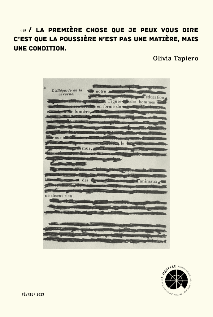 Olivia Tapiero est écrivaine, traductrice et musicienne. Elle a signé plusieurs ouvrages, dont Les murs (prix Robert-Cliche 2009, finaliste au Prix Senghor 2010), Phototaxie (2017) / Phototaxis (2021), et Rien du tout, finaliste au Grand Prix du Livre de Montréal et aux Prix littéraires du Gouverneur Général en 2021. On peut lire ses essais et ses poèmes dans différentes revues, dont Spirale, Lettres québecoises, Muscle, Estuaire et tristesse. Depuis 2022, elle est rédactrice en chef de la revue de création littéraire Moebius. Elle vit à Montréal.