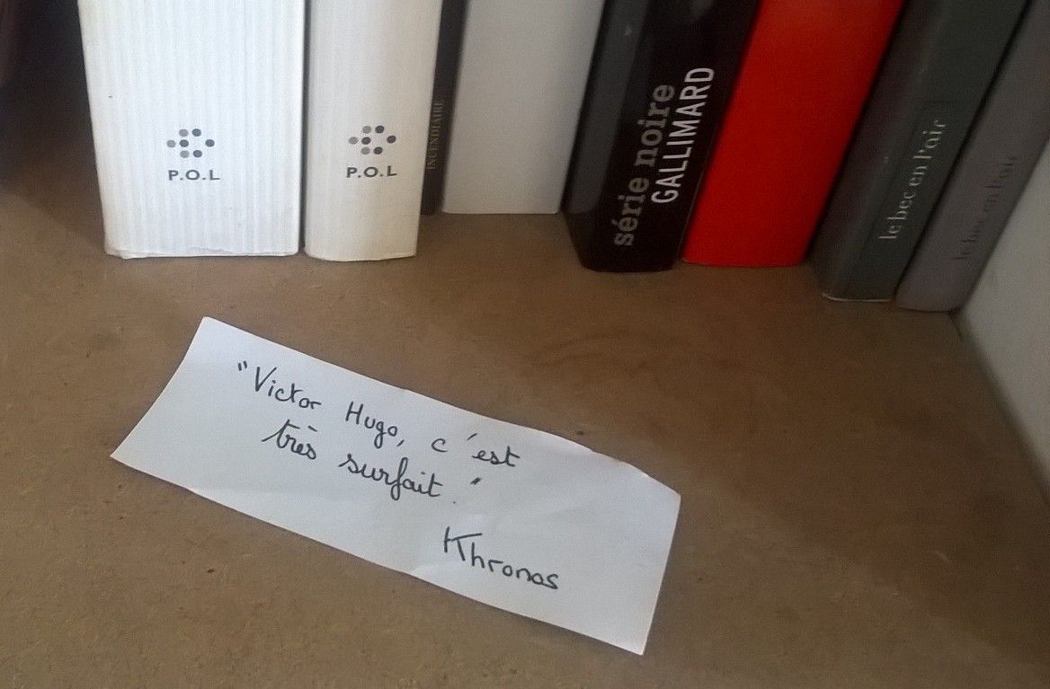J’ai donc bien failli le jeter le billet de Khronos, vous ai-je dit, mais je ne serai jamais le bourreau de la liberté de penser. Reste tout de même l’intransigeance de la sanction avec laquelle je suis en délicatesse : « Victor Hugo, c’est très surfait ». Opinion ferme et définitive ? Farce ? Provocation artistique ? Politique ? Fondée ? Infondée ? Mépris ? Méconnaissance ? Que sais-je ? Moi, je n’ai pas été biberonné à l’école du cynisme mais à celle de la maïeutique. Alors si l’auteur du billet de la bibliothèque du salon de La Marelle m’entend, je l’invite à m’éclairer sur ce qui le fâche tant, et le remercie, quoi qu’il en soit, de m’avoir mis en garde bien involontairement contre la pédanterie du verbe. Je remets donc bien sagement ce billet à sa place, sur son étagère, en attendant de ses nouvelles. « Aimer c’est agir » écrivait Victor Hugo. J’écris.