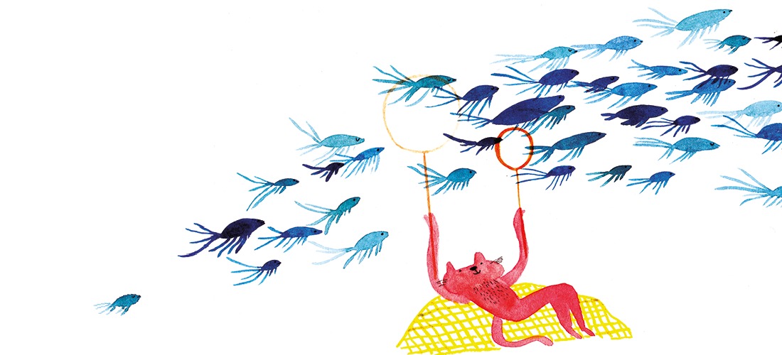 Ses aquarelles mêlent et entremêlent les transparences pour faire naître de nouvelles formes. La forme devient répétitive, motif, série, collection. Il y a dans ses illustrations faussement naïves, de l’humour et puis de la poésie aussi.
