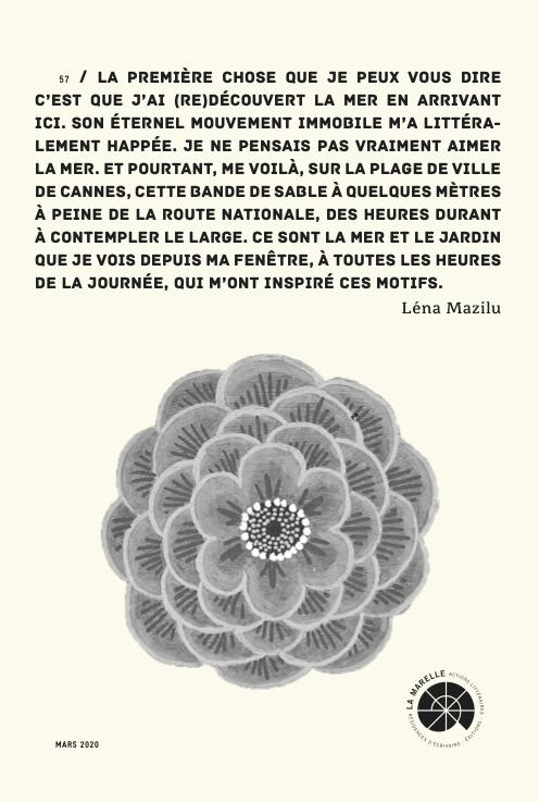 Léna Mazilu est la lauréate 2018 de l’appel à projets pour une résidence auteur·trice-illustrateur·trice « Littérature jeunesse », proposé par La Marelle avec la Mairie de Cannes (Médiathèque de Cannes), en partenariat avec le Festival du livre de Mouans-Sartoux, et avec l’aide financière de la Drac Paca.