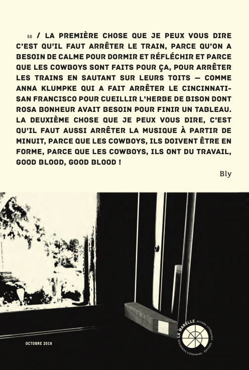 L’univers de Bly se déploie donc sur fond de western atemporel en technicolor. Mais le roman de Bly ne saurait se réduire au résumé des aventures qu’il va traverser. Il ne s’agit pas de raconter une énième histoire de cowboys. Il faut savoir par exemple, que Bly a déjà croisé Roland Barthes dans un canyon, Hampâté Bâ à Beaubourg et trouvé de l’or sur l’île de Groix. Bly, c’est un héros positif qui roule sa bosse, c’est un ton, une philosophie, un monde qui fait écho au nôtre, qui a sa langue, qui prend des formes. Dans Bly, on s’interroge, on s’amuse, on réfléchit.