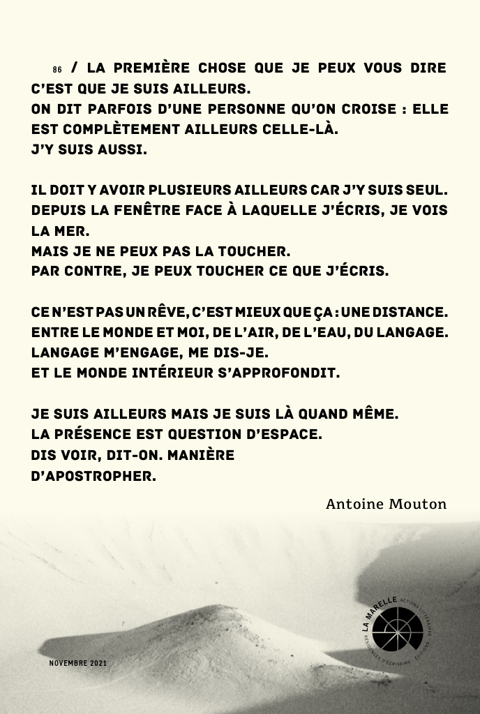 Antoine Mouton effectue sa résidence à La Marelle en deux temps, d’abord à Marseille dans l’appartement situé à proximité du Palais Longchamp, puis à La Ciotat, à la Villa Deroze.