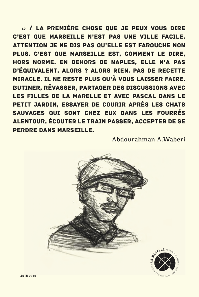 Ce texte est a priori destiné à devenir la partie fiction d’un film qui sera le premier à être consacré à Mamadou Konté, fiction qui va se glisser harmonieusement dans le flux d’images d’archive. Il me plaît beaucoup d’écrire la première mouture de ce scénario à Marseille lors de ma résidence à La Marelle. D’humer l’air si singulier de la cité phocéenne. De remettre mes pas dans ceux de Mamadou Konté qui est arrivé en France en 1965 – année de ma naissance – via le port de Marseille.