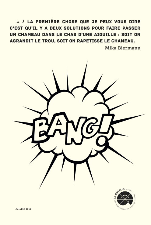 La Marelle est très heureuse d’avoir accompagné cette expérience inédite de résidence d’auteur en prison. Ce dispositif de résidence permet la présence particulière de l’auteur dans l’espace de la prison, et l’immersion pour l’auteur dans un monde auquel peu ont accès. L’équilibre entre ce que l’on donne et ce que l’on reçoit apparaît bien comme la condition de la véritable rencontre.