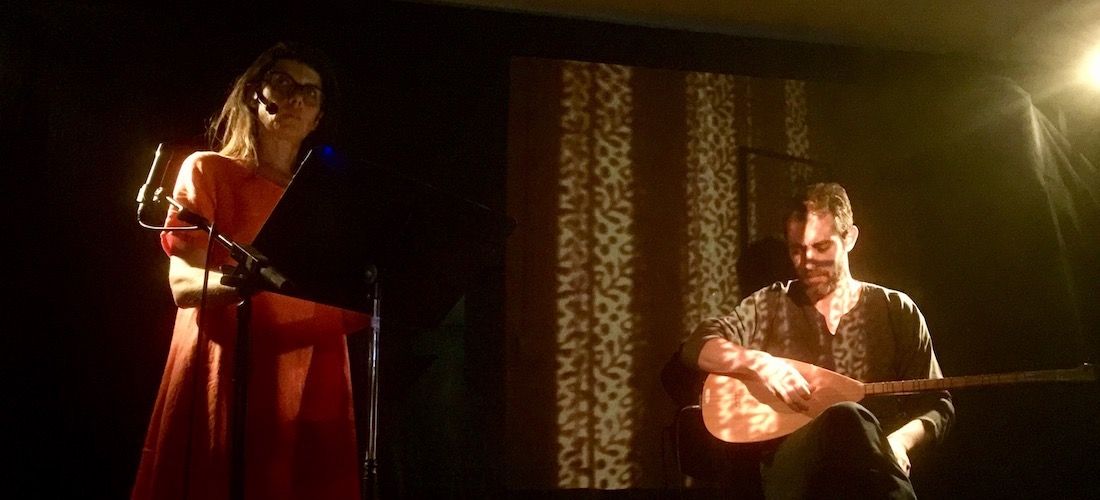 Le dispositif de cette lecture musicale est très simple : une petite scène, ou un espace intime, où sont installés l’autrice/lectrice et le musicien. Ils se regardent, leurs voix s’entremêlent, texte et musique dialoguent.